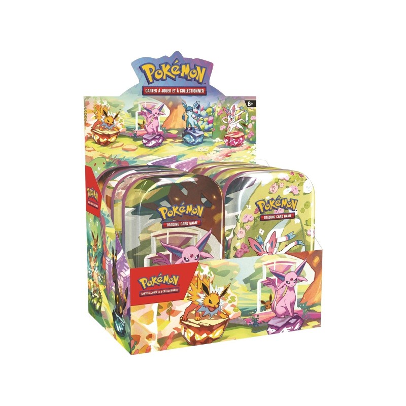 Includes two Scarlet & Violet—Prismatic Evolutions booster packs; one art card matching the tin, featuring Vaporeon, Jolteon, Flareon, Espeon, Umbreon, Leafeon, Glaceon or Sylveon; and one coin featuring Eevee.
